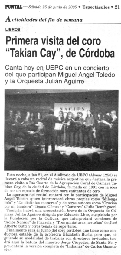 Actuación de la Agrupación Coral de Cámara en Río Cuarto (Diario Puntal, 25.06.2005) Ver más imágenes del concierto |
